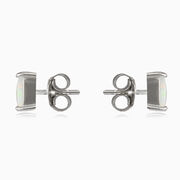 Čtvercové bílé opálové náušnice, vyrobené z rhodiovaného stříbra ryzosti 925/1000, v lesklé povrchové úpravě, zapínání na puzetu.
