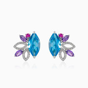 Náušnice z bílého 14K zlata s modrým topazem broušeným ve tvaru "marquise" v kombinaci s bílými diamanty o veliksti 0,43ct, a také ametystem ve tvaru "marquise" a kulatým rubellitem.