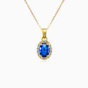 Přívěsek je vyroben ze 14kt žlutého zlata s tmavě modrým křemenem oválného brusu, který je obklopen bílými krystaly.