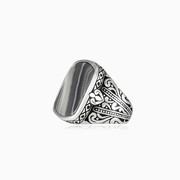 Pánský prsten v orientálním stylu z rhodiovaného stříbra ryzosti 925/1000 zdobený šedým achátem.