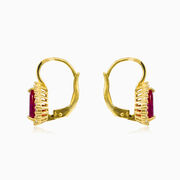 Königliche Ohrringe aus 14K Gelbgold, kombiniert mit Rubellit im Birnenschliff und einem Halo aus Kristallen.