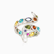 Dieser hübsche Mosaico-Schlangenring ist komplett von Hand aus 14-karätigem Weißgold mit vielen Farbsteinen in verschiedenen Formen und Größen gefertigt.