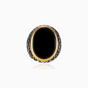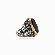 Unique sterling silver ring which is gold plated on top all around oval cut onyx and decorated with bird details on both sides.