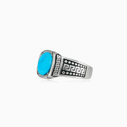 Unique sterling silver ring for men decorated with greek patterns and topped with oval cut flat turquoise.