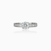Classic accent ring with big round cut crystal in the center and four crystals on the shoulders.