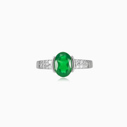 Oval cut green jade set in semi bezel sterling silver ring decorated with crystals.