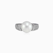 Moderno anillo de plata esterlina para mujeres combinado con perla redonda y cristales a los lados.