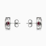 Aretes redondos de plata combinados con un bisel central de cuarzo rojo y un halo de cristales a su alrededor.
