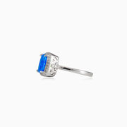 Bague en argent sterling combinée à une opale bleue coupée en rectangle et décorée d'un halo de cristaux.