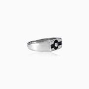 Мужское кольцо из родированного серебра 925 пробы, украшенное чёрной эмалью и белым кристаллом бриллиантовой огранки.