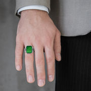 Мужское кольцо из родированного серебра с зелёным нефритом изумрудной огранки. Ободок кольца изготовлен в форме ремешка в стиле Oyster.