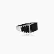 Мужское кольцо из родированного серебра 925 пробы, декорированное ониксом и чёрной шпинелью.