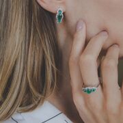 Кольцо из родированного серебра 925 пробы с центральним нефритом овальной огранки и двумя нефритами огранёнными в форме капли по бокам, в окружении белых кристаллов.