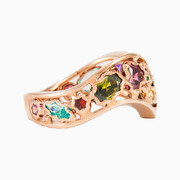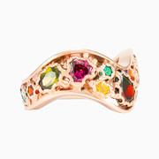 Изогнутое кольцо из коллекции MOSAICO ручной работы из жёлтого золота 585 пробы с красным гранатом, аметистом, оливином, цитрином, турмалином, перидотом и голубым топазом разных форм и размеров.