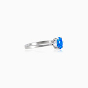 Утонченное и изящное кольцо из родированного серебра 925 пробы с потрясающим синим опалом овальной огранки расположенным между двумя треугольными кристаллами.