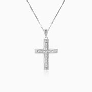 Крест из родированного серебра украшенный белыми кристаллами бриллиантовой огранки.