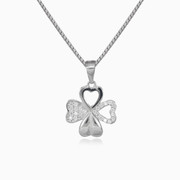 Подвеска из родированного серебра 925 пробы в форме четырёхлистного клевера украшенного белыми круглыми кристаллами.