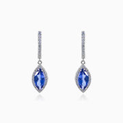 Moderní náušnice z rhodiovaného stříbra ryzosti 925/1000 s tanzanitem broušeným do tvaru Marquiseý v kombinaci s bílými krystalky diamantového brusu.