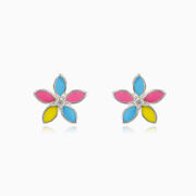 Drobné stříbrné náušnice pro děti ve tvaru květu, zdobené barevným smaltem a středovým krystalem.