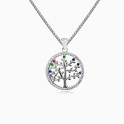 Stříbrný kulatý přívěsek ve tvaru Stromu života z rhodiovaného stříbra ryzosti 925/1000, ozdobený barevným křemenem který dokola obklopují zářivé bílé krystaly.
