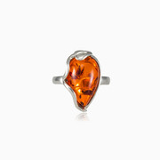 Stříbrný prsten je vyroben ručně a zdoben medovým jantarem ve tvaru kapky.