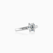 Elegantní zásnubní prsten z 14K bileho zlata s centrálním kystalem diamantového brusu, který je pevně usazen do šesti krapen.