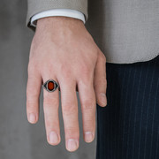 Pánský prsten z rhodiovaného stříbra, zdobený červeným achátem oválného tvaru a černým spinelem.