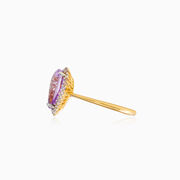 Königlicher Ring aus 14 Karat Roségold, kombiniert mit einem Amethyst im Birnenschliff und einem Halo aus Kristallen.