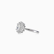 Königlicher Sterlingsilberring für Frauen, kombiniert mit einem zentralen Kristall und einem Halo aus Kristallen.