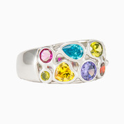 Dieser hübsche Mosaico-Breitbandring ist komplett von Hand aus 14-karätigem Weißgold gefertigt und mit zwei Reihen von Farbsteinen in verschiedenen Formen und Größen besetzt.