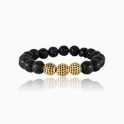 Dieses Armband besteht aus natürlichen Lavaperlen und ist mit drei vergoldeten Stahlkugeln kombiniert. Tiefschwarze Spinelle zieren jede der Stahlkugeln.