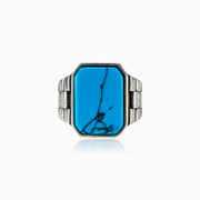 Flacher Türkis im Smaragdschliff, besetzt mit einem handgefertigten Ring aus Sterlingsilber, der an den Seiten mit einem starren Austernriemen verziert ist.
