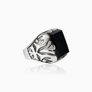 Einzigartiges Schmuckstück, bei dem ein detaillierter Sterlingsilberring auf einen rechteckig geschnittenen flachen Onyx trifft.