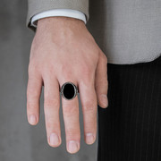 Oval and flat cut onyx bezel set in handcrafted sterling silver ring with oriental ornaments on both sides.