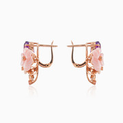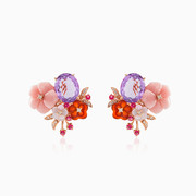 Blooming earrings are spring/summer earrings which remind of warmer and brighter days. This beautiful pair of earrings is made of 14kt rose gold combined with diamonds 0.19ct, oval cut amethyst, round cut amethyst and flower shaped quartz and perlet.