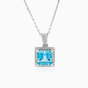 Elegant, natural aquamarine square pendant with total weight 1.0ct, set in 18k white gold. Aquamarine framed by a dazzling halo of diamonds pavé-set round brilliant cut diamonds with a total weight 0.12ct.