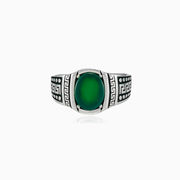 Único anillo de plata de ley para hombres decorado con motivos griegos y cubierto con jade plano de corte ovalado.