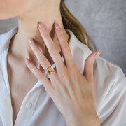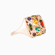 Este bonito anillo cuadrado de mosaico está hecho totalmente a mano en oro rosa de 14k con piedras de colores de diferentes formas y tamaños.