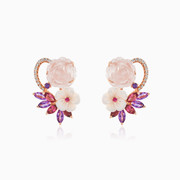 Pendientes únicos hechos a mano en oro rosa de 14kt combinado con diamantes de 0,18ct, amatista y rubelita de corte marquesa y rubelita en forma de flor y cuarzo rosa.
