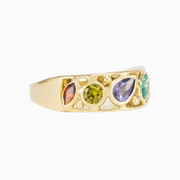 Cette jolie bague Mosaïco est entièrement faite à la main en or avec des pierres de couleur de différentes formes et tailles.