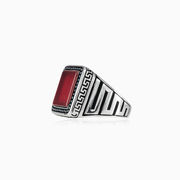 Bague pour homme en argent sterling combinée avec de l'agate rouge et décorée de motifs grecs sur les côtés.
