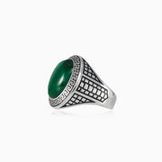 Cabochon et jade vert de coupe ovale sertis dans une bague en argent sterling qui est décorée des deux côtés d'un motif grec.