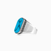 Bague pour homme en argent sterling poli, décorée d'un motif grec sur les côtés et surmontée d'une turquoise taillée à plat.