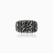 Мужское кольцо из родированного серебра с восточными узорами по сторонам.